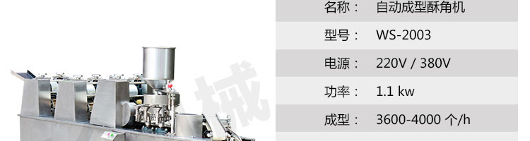WS-2003 型自动成型酥角机(油饺机),适用于制作酥角、油饺,可包的馅有:花生、椰蓉、白糖等。适合多种面粉材料、并且成型封口美观牢固。小模约47mm,大模约57mm随机标配一套模具。购机赠送工艺配方。