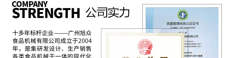 广州旭众食品机械有限公司是一家集科研开发,生产设计,营销服务为一体的现代化生产企业。现代化生产车间,精湛制造技术,所产机械历经市场重重考验,不断赢得海内外客户的赞誉。